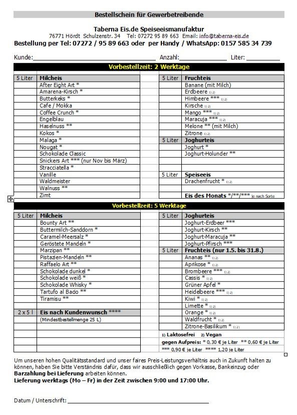 Mit unserem PDF-Bestellformular bestellen Sie Ihr Eis genau so, wie es in Ihren Betriebsablauf passt. Wählen Sie aus unserer aktuellen Sortenliste die gewünschten Mengen und Sorten – ganz unkompliziert.